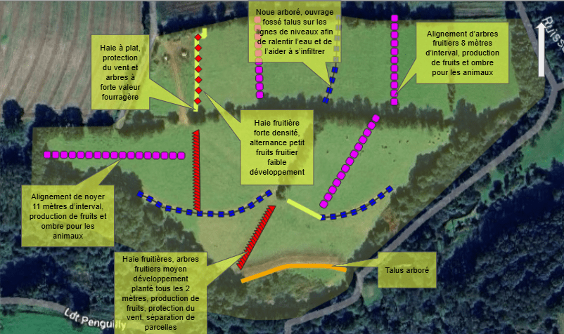 Après trois ans de projets successifs, on arrive à un total de 700 ml de système agroforestier, comprenant 672 arbres et arbustes champêtres ou fruitiers.